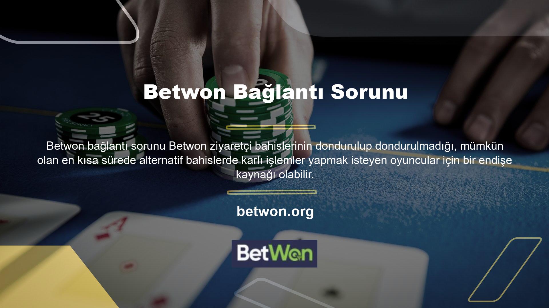 En çok tercih edilen bahis sitelerinden biri olan Betwon, özellikle canlı bahis tutkunlarına hitap ediyor. Binlerce çevrimiçi bahis tutkunu, sayısız bahis seçeneği sunan Betwon’da çok daha hızlı bir şekilde eğleniyor ve para kazanıyor. Kapsamlı Betwon bahis yayınlarıyla Betwon, dünyanın dört bir yanından daha önce hiç karşılaşmadığınız organizasyonlara bile bahis imkanı sunuyor. Betwon’un özel online bahis web sayfasında arama kutusunu kullanarak aradığınız müsabakayı hızlıca bulabilirsiniz.